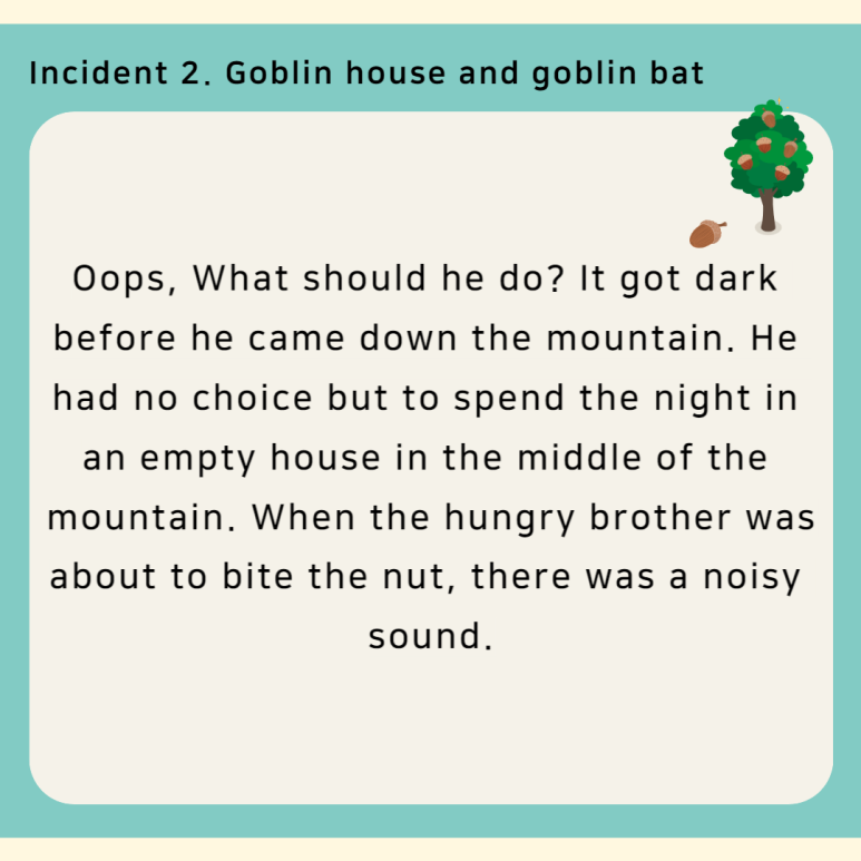 Oops, What should he do? It got dark before he came down the mountain. He had no choice but to spend the night in an empty house in the middle of the mountain. When the hungry brother was about to bite the nut, there was a noisy sound.