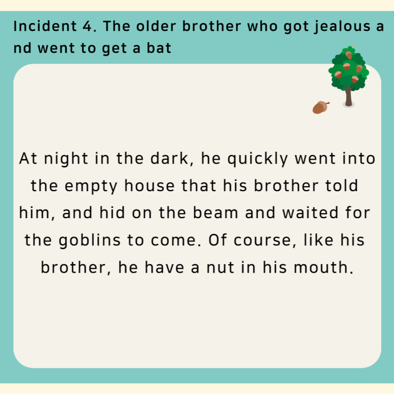 The greedy older brother heard the news, he soon went up the mountain and pretended to cut the trees. As expected, the nuts rolled over one by one. Unlike his brother, however, the greedy brother put them in his pocket, determined to eat all of them by himself. At night in the dark, he quickly went into the empty house that his brother told him, and hid on the beam and waited for the goblins to come. Of course, like his brother, he have a nut in his mouth.