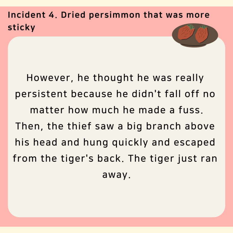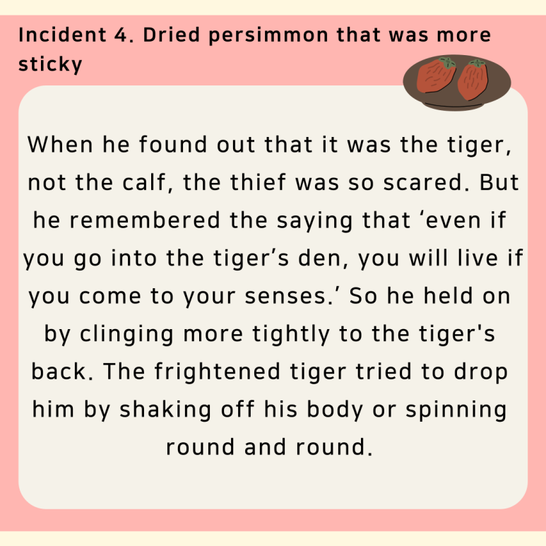 But then, a thief who tried to steal an ox came into the barn at the same time as the tiger. The thief fumbled through the dark barn and touched the tiger and mistook it for a calf. The tiger felt the touch of the thief and thought he was caught by a scary ‘dried persimmon’, so he was shaking and tight.