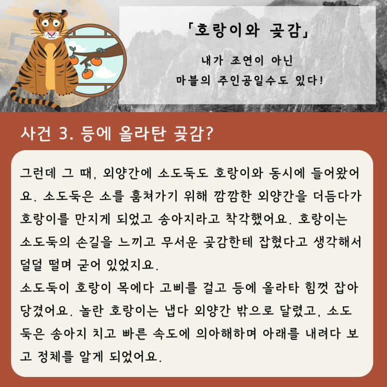 When he found out that it was the tiger, not the calf, the thief was so scared. But he remembered the saying that ‘even if you go into the tiger’s den, you will live if you come to your senses.’ So he held on by clinging more tightly to the tiger's back. The frightened tiger tried to drop him by shaking off his body or spinning round and round. However, he thought he was really persistent because he didn't fall off no matter how much he made a fuss.