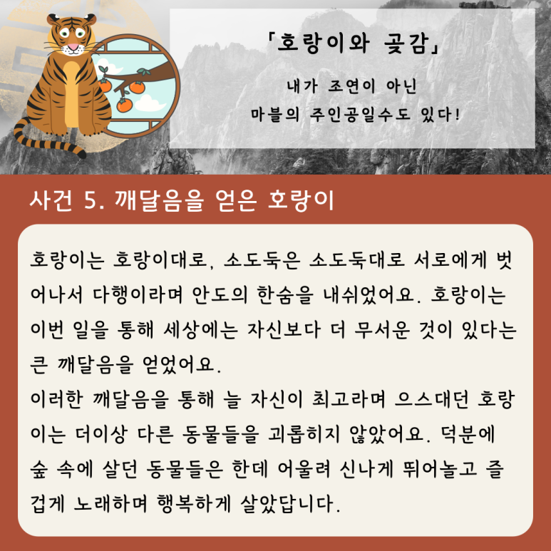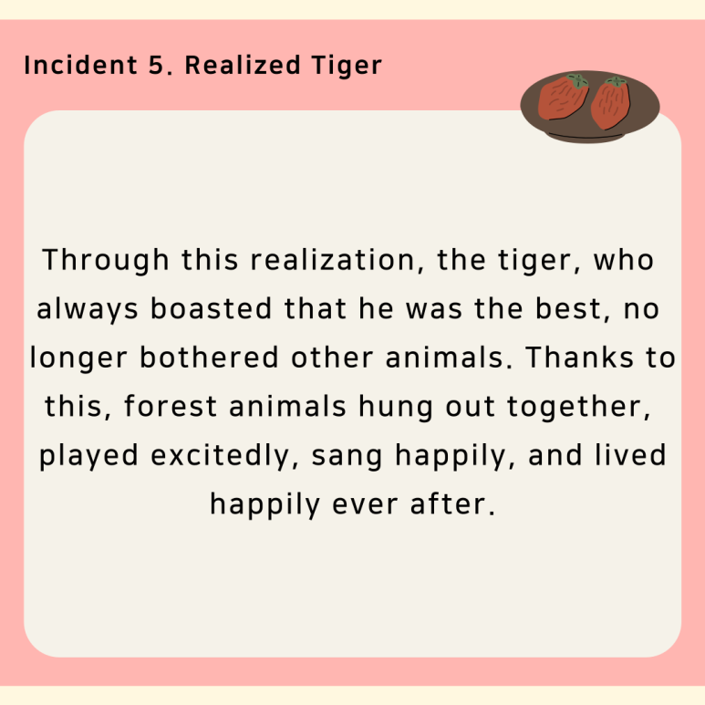 이러한 깨달음을 통해 늘 자신이 최고라며 으스대던 호랑이는 더이상 다른 동물들을 괴롭히지 않았어요. 덕분에 숲 속에 살던 동물들은 한데 어울려 신나게 뛰어놀고 즐겁게 노래하며 행복하게 살았답니다.
