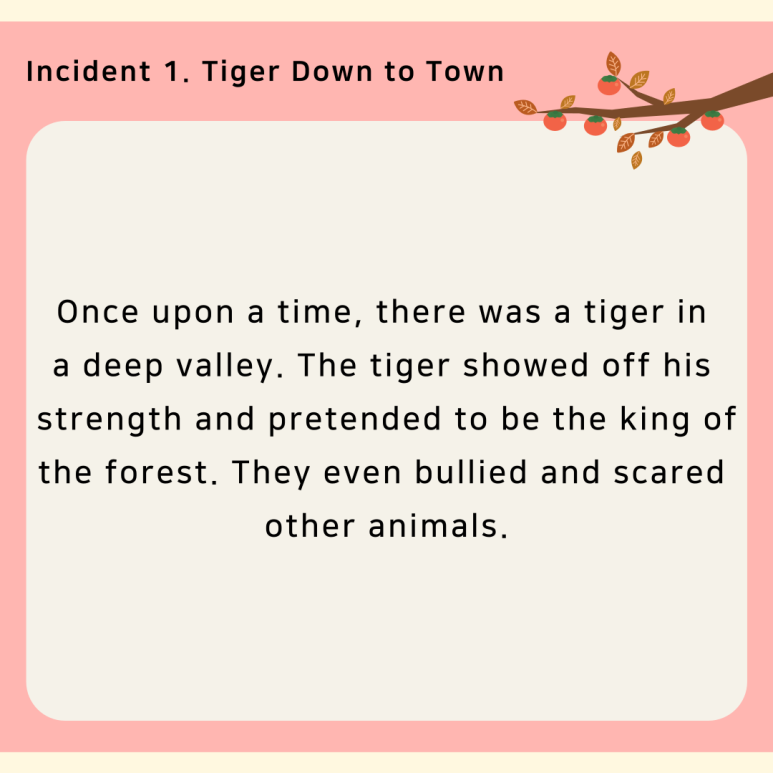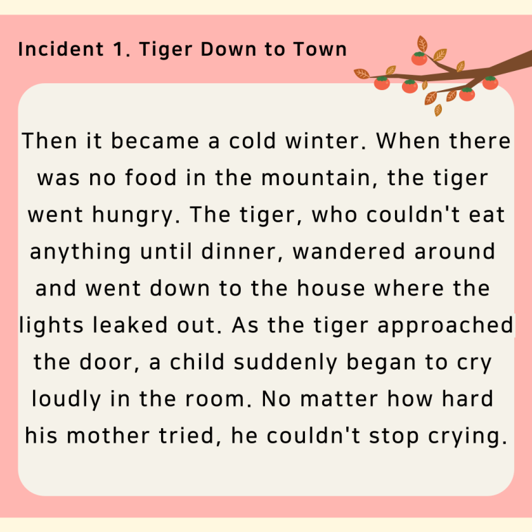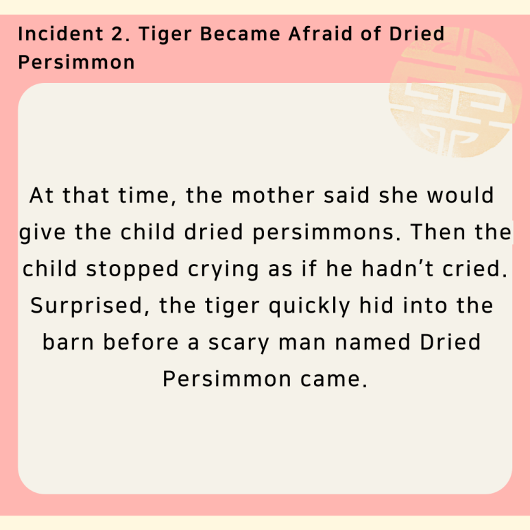 At that time, the mother said she would give the child dried persimmons. Then the child stopped crying as if he hadn’t cried. Surprised, the tiger quickly hid into the barn before a scary man named Dried Persimmon came.
