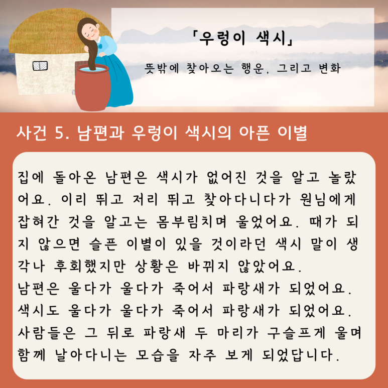 집에 돌아온 남편은 색시가 없어진 것을 알고 놀랐어요. 이리 뛰고 저리 뛰고 찾아다니다가 원님에게 잡혀간 것을 알고는 몸부림치며 울었어요. 때가 되지 않으면 슬픈 이별이 있을 것이라던 색시 말이 생각나 후회했지만 상황은 바뀌지 않았어요.