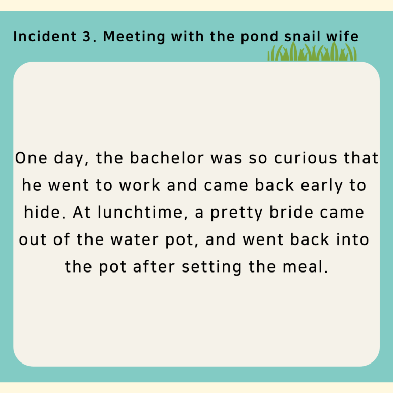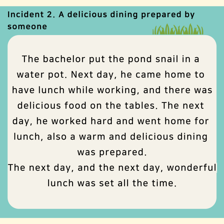The bachelor put the pond snail in a water pot. Next day, he came home to have lunch while working, and there was delicious food on the tables. The next day, he worked hard and went home for lunch, also a warm and delicious dining was prepared.