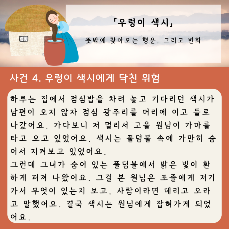 총각은 너무 궁금한 나머지, 하루는 일을 갔다가 일찍 들어와서 숨어 있었어요. 점심때가 되니까 물 항아리 안에서 어여쁜 색시가 나오더니 밥을 차리고는 물 항아리 속으로 다시 들어가려는 게 아니겠어요?