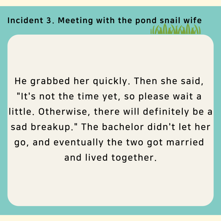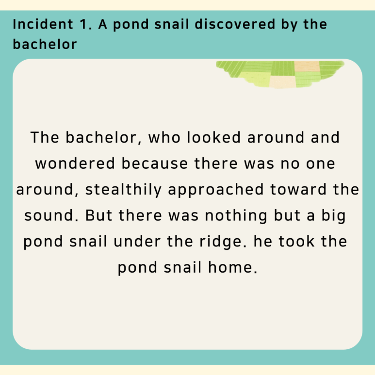 The bachelor, who looked around and wondered because there was no one around, stealthily approached toward the sound. But there was nothing but a big pond snail under the ridge. he took the pond snail home.