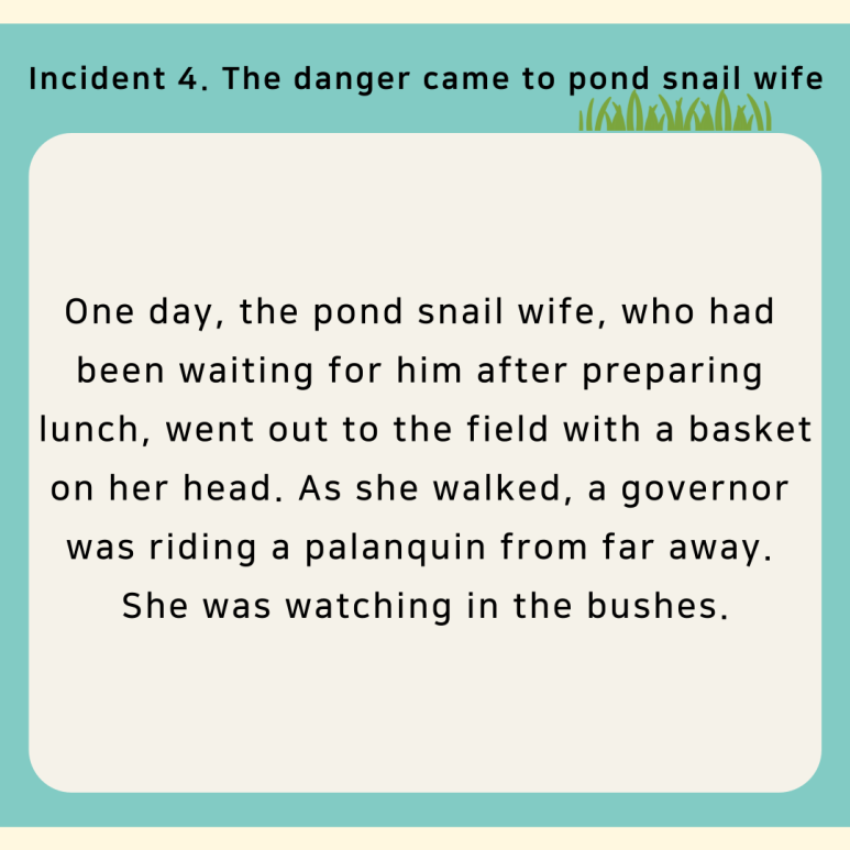 One day, the pond snail wife, who had been waiting for him after preparing lunch, went out to the field with a basket on her head. As she walked, a governor was riding a palanquin from far away. She was watching in the bushes.