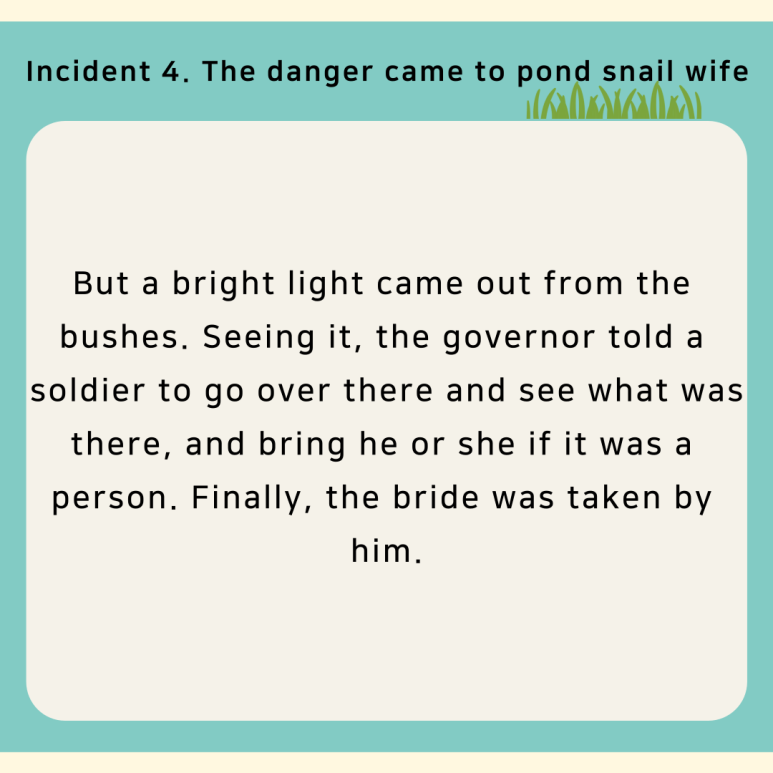 But a bright light came out from the bushes. Seeing it, the governor told a soldier to go over there and see what was there, and bring he or she if it was a person. Finally, the bride was taken by him.