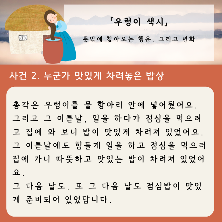총각은 우렁이를 물 항아리 안에 넣어뒀어요. 그리고 그 이튿날, 일을 하다가 점심을 먹으려고 집에 와 보니 밥이 맛있게 차려져 있었어요. 그 이튿날에도 힘들게 일을 하고 점심을 먹으러 집에 가니 따뜻하고 맛있는 밥이 차려져 있었어요.