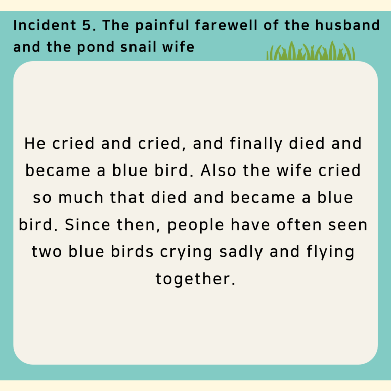 He cried and cried, and finally died and became a blue bird. Also the wife cried so much that died and became a blue bird. Since then, people have often seen two blue birds crying sadly and flying together.