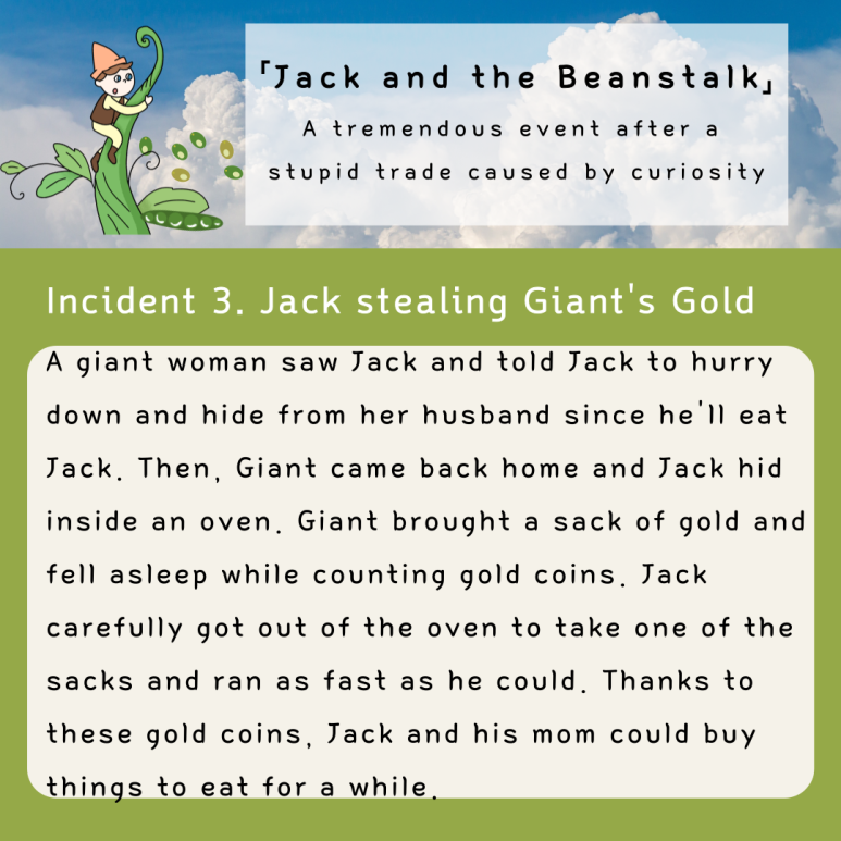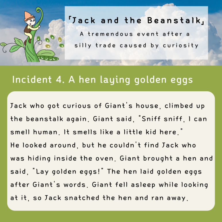 after Giant's words. Giant fell asleep while looking at it, so Jack snatched the hen and ran away.