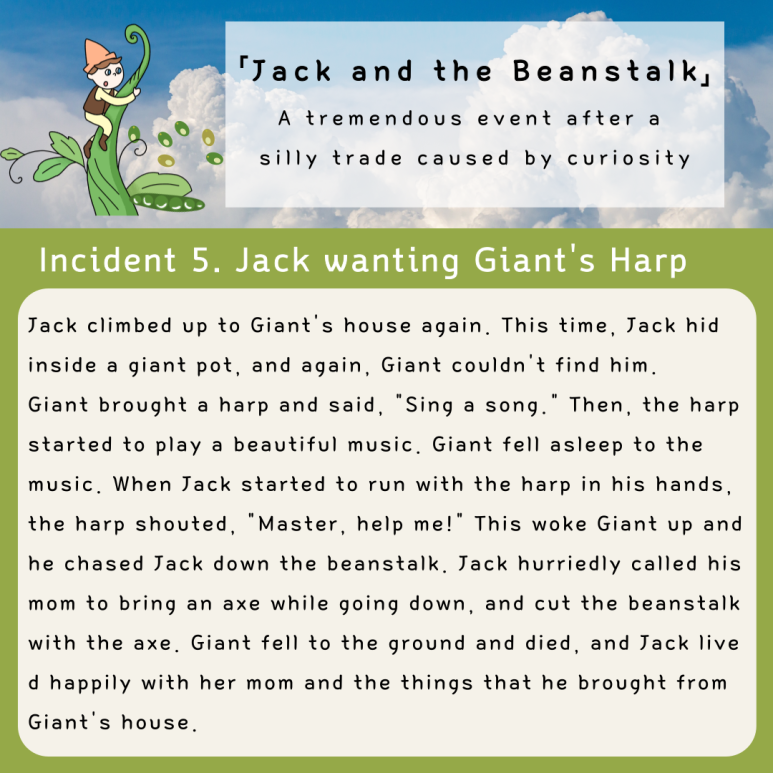 music. When Jack started to run with the harp in his hands, the harp shouted, "Master, help me!" This woke Giant up and he chased Jack down the beanstalk. Jack hurriedly called his mom to bring an axe while going down, and cut the beanstalk with the axe. Giant fell to the ground and died, and Jack lived happily with her mom and the things that he brought from Giant's house.
