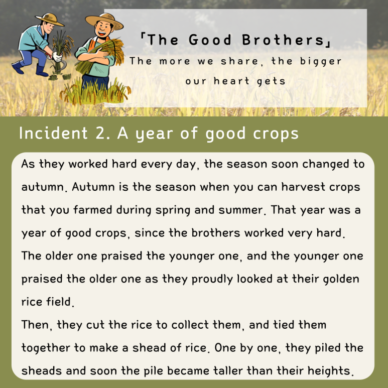 As they worked hard every day, the season soon changed to autumn. Autumn is the season when you can harvest crops that you farmed during spring and summer. That year was a year of good crops, since the brothers worked very hard.The older one praised the younger one, and the younger one praised the older one as they proudly looked at their golden rice field.