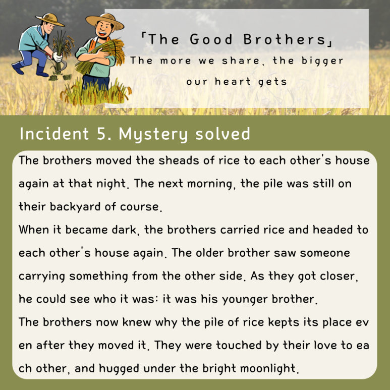 The brothers now knew why the pile of rice kepts its place even after they moved it. They were touched by their love to each other, and hugged under the bright moonlight.