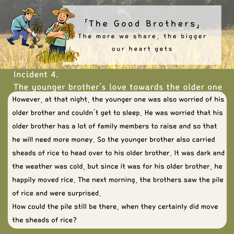 However, at that night, the younger one was also worried of his older brother and couldn't get to sleep. He was worried that his older brother has a lot of family members to raise and so that he will need more money. So the younger brother also carried sheads of rice to head over to his older brother. It was dark and the weather was cold, but since it was for his older brother, he happily moved rice. The next morning, the brothers saw the pile of rice and were surprised.