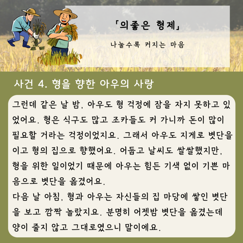 의좋은 형제는 수확한 볏단을 공평하게 똑같이 나누고, 각자의 집 마당에 차곡차곡 쌓았어요. 그날 밤, 형은 아우의 걱정에 잠이 오지 않았어요. 이제 막 결혼하여 살림을 차린 아우가 돈이 많이 필요할 거라는 걱정이었지요. 그래서 형은 아우에게 볏단을 더 가져다주기로 마음 먹었어요. 형은 캄캄한 저녁 홀로 볏단을 가득 실은 지게를 지고 아우의 집으로 향했어요. 아우네 집 마당에 쌓인 볏단에 가져온 볏단을 옮긴 형은 내일 일어나서 기뻐할 아우를 생각에 뿌듯했답니다.