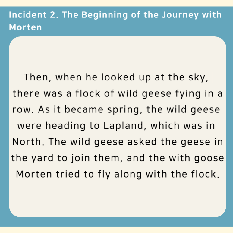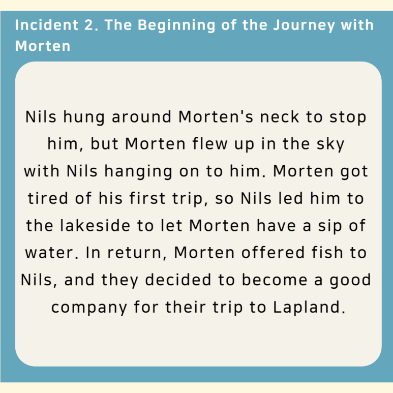 Then, when he looked up at the sky, there was a flock of wild geese fying in a row. As it became spring, the wild geese were heading to Lapland, which was in North. The wild geese asked the geese in the yard to join them, and the with goose Morten tried to fly along with the flock. Nils hung around Morten's neck to stop him, but Morten flew up in the sky with Nils hanging on to him. Morten got tired of his first trip, so Nils led him to the lakeside to let Morten have a sip of water. In return, Morten offered fish to Nils, and they decided to become a good company for their trip to Lapland.