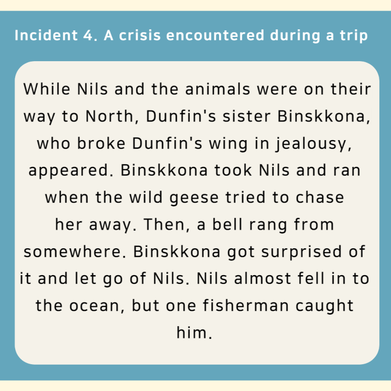 While Nils and the animals were on their way to North, Dunfin's sister Binskkona, who broke Dunfin's wing in jealousy, appeared. Binskkona took Nils and ran when the wild geese tried to chase her away. Then, a bell rang from somewhere. Binskkona got surprised of it and let go of Nils. Nils almost fell in to the ocean, but one fisherman caught him.