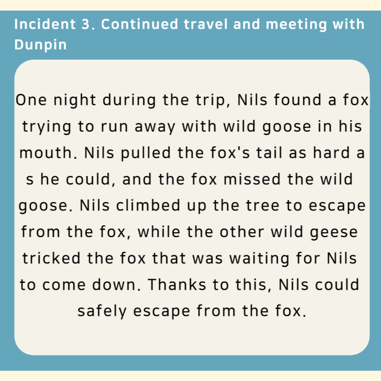 One night during the trip, Nils found a fox trying to run away with wild goose in his mouth. Nils pulled the fox's tail as hard as he could, and the fox missed the wild goose. Nils climbed up the tree to escape from the fox, while the other wild geese tricked the fox that was waiting for Nils to come down. Thanks to this, Nils could safely escape from the fox.