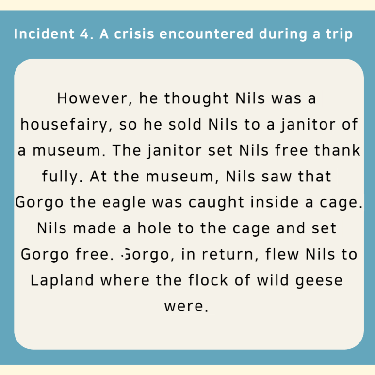 However, he thought Nils was a housefairy, so he sold Nils to a janitor of a museum. The janitor set Nils free thankfully. At the museum, Nils saw that Gorgo the eagle was caught inside a cage. Nils made a hole to the cage and set