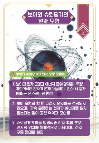 보어는 수소 원자의 선 스펙트럼을 설명하기 위해 전자가 원형 궤도를 따라 운동한다고 제안했지만 다전자 원자에는 적용되지 않는 한계가 있었으며, 이후 슈뢰딩거는 전자의 파동성을 바탕으로 확률적 전자 분포를 설명하는 양자 역학적 원자 모형을 제시하였다.