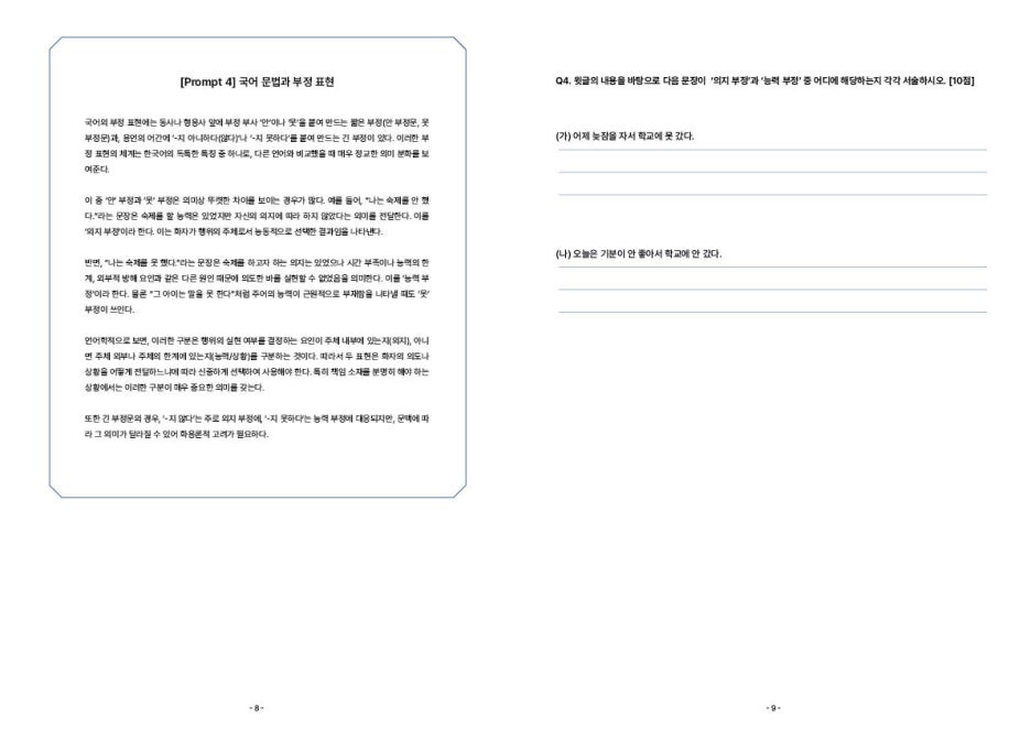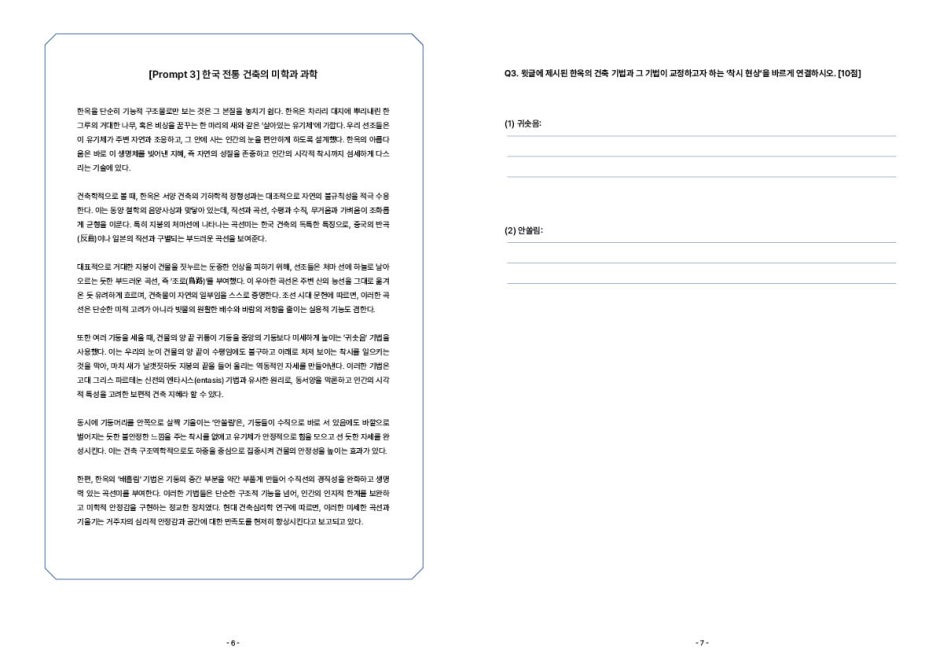 을지대 논술의 가장 큰 특징은 70분 동안 두 과목의 문항을 풀어야 한다는 것입니다. 문제 1부터 7까지는 국어 문항, 문제 8부터 14까지는 수학 문항으로 구성됩니다.