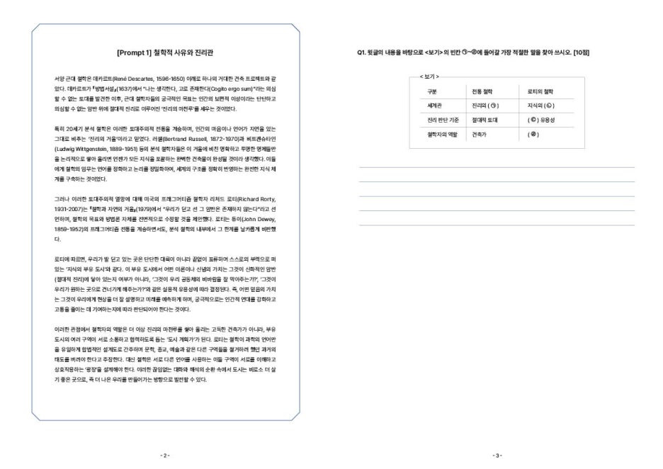 2. 답안 작성 특징: 장문 논술이 아닌 핵심어나 문장, 수식으로 간결하게 답변하는 형식. 제시문이나 보기에서 답의 근거를 찾아 서술하는 것이 핵심. 복잡한 논증 과정보다 문해력과 문제 풀이 능력 평가.